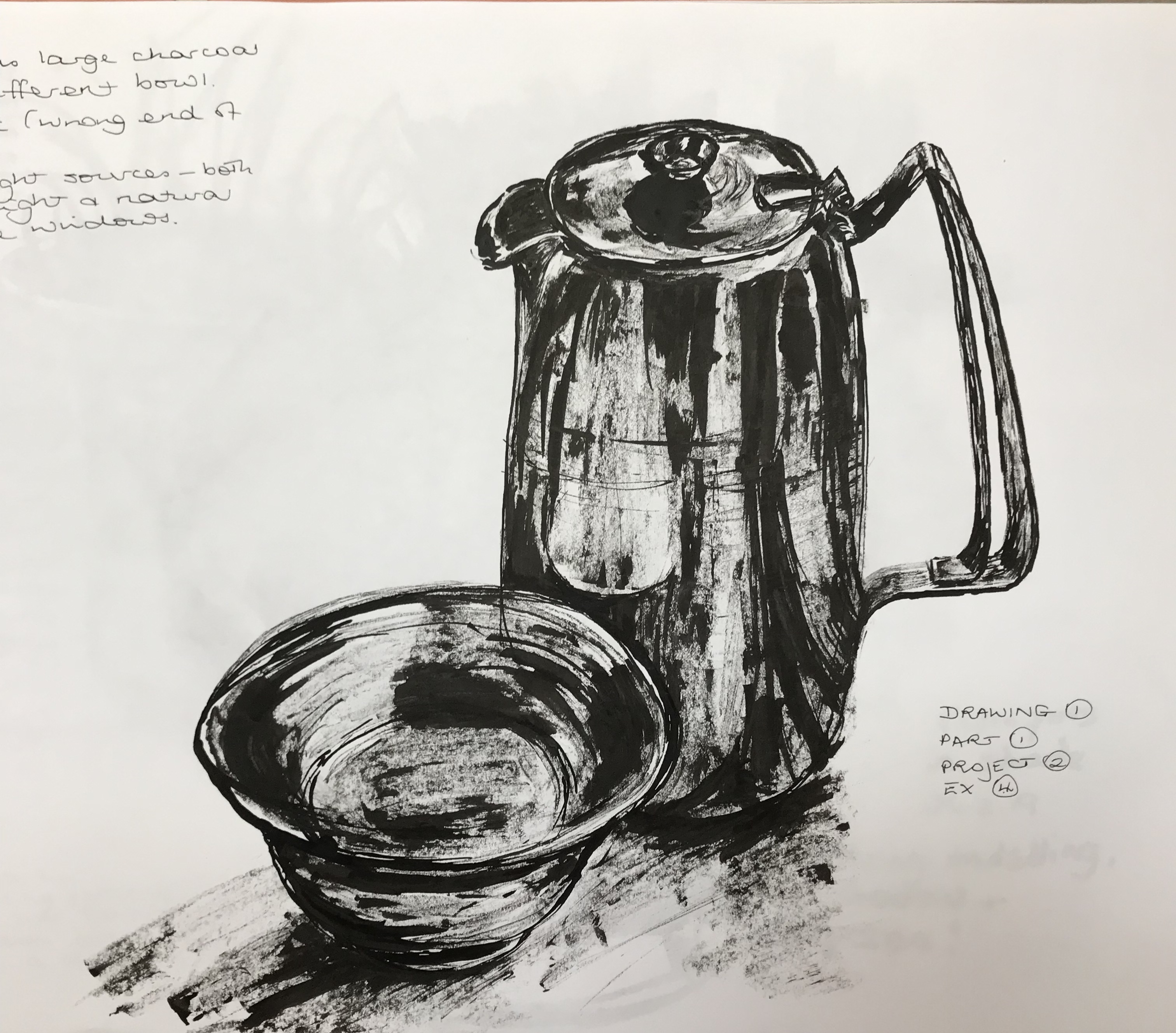 We were asked to do the drawing in charcoal, so I followed the brief, but I also wanted to try a similar drawing in stick-and-ink, which was the other medium I have really enjoyed using throughout this unit so far. So, different art group, same jug, different bowl….