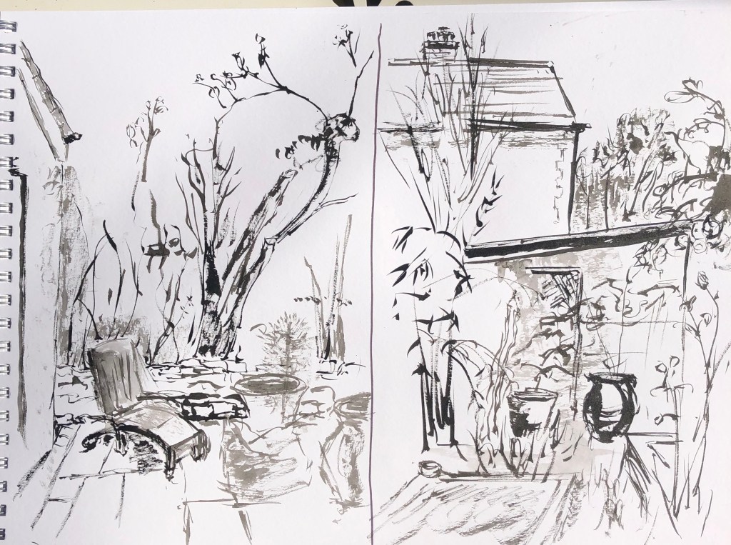 I started off with a distinctly unexpansive landscape, but one where I could sit comfortably at a table and chair – my back walled garden. It was a lovely sunny afternoon but shadows are stronger as the sun gets that little bit lower towards the end of September and the garden really is enclosed all the way round by walls and hedges except for one path through, so I felt that a bold medium was called for; I chose Chinese brush and ink. These are the views from West, North, East and South.
